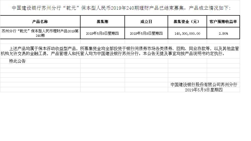 中国建设银行苏州分行“乾元”保本型人民币2019年240期理财产品成立公告